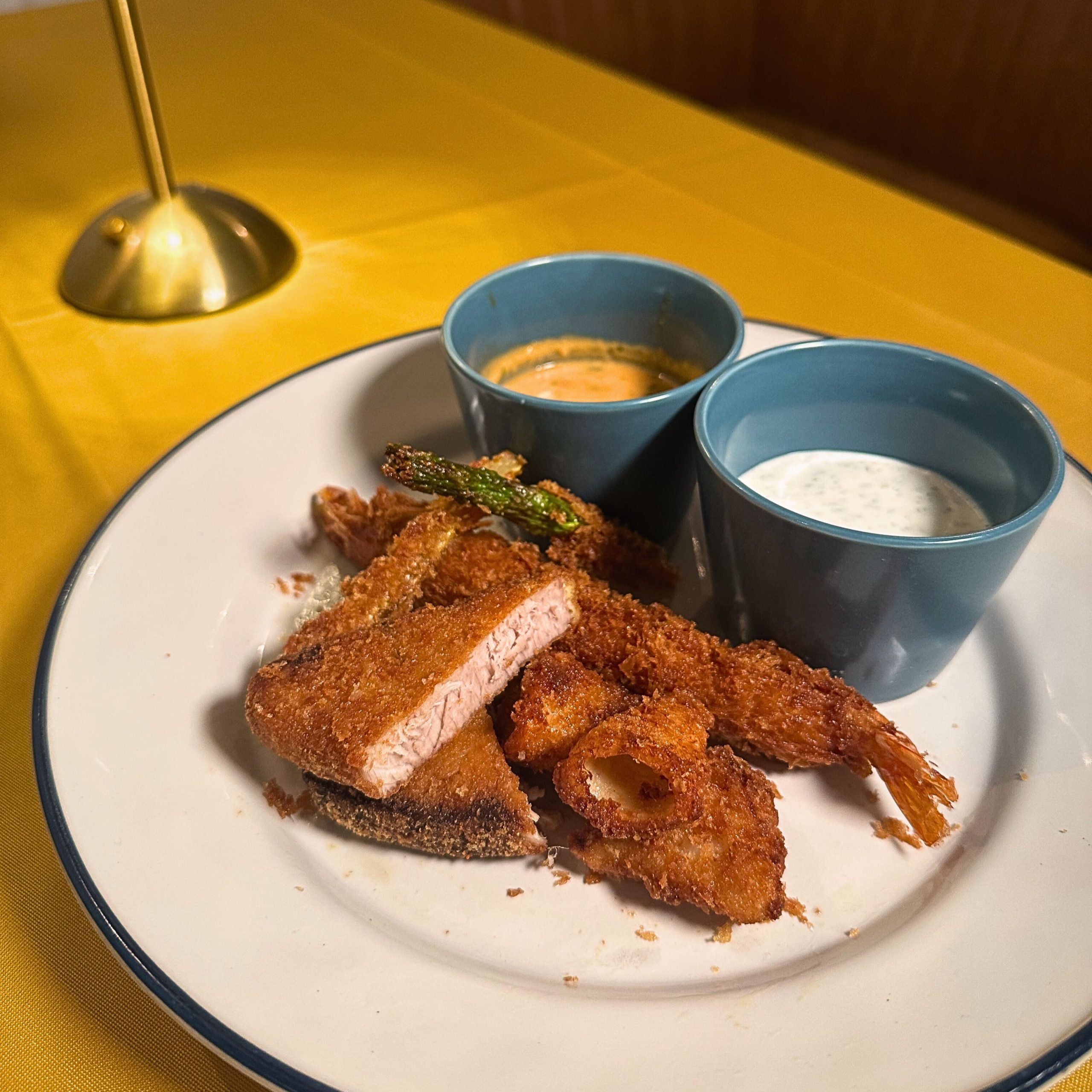 大ぶりシーフードとアスパラの贅沢ミックスフライ・サワークリームとトマトのグレモラータソース2,000円(税込) -